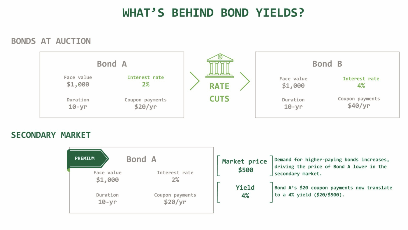 Remember: Yield and interest rates aren’t the same thing. If a $1,000 bond pays $20 in interest, the yield is 2%. However, if the price of that bond falls to $500, and it continues to pay a fixed interest payment of $20, the yield is now 4%.